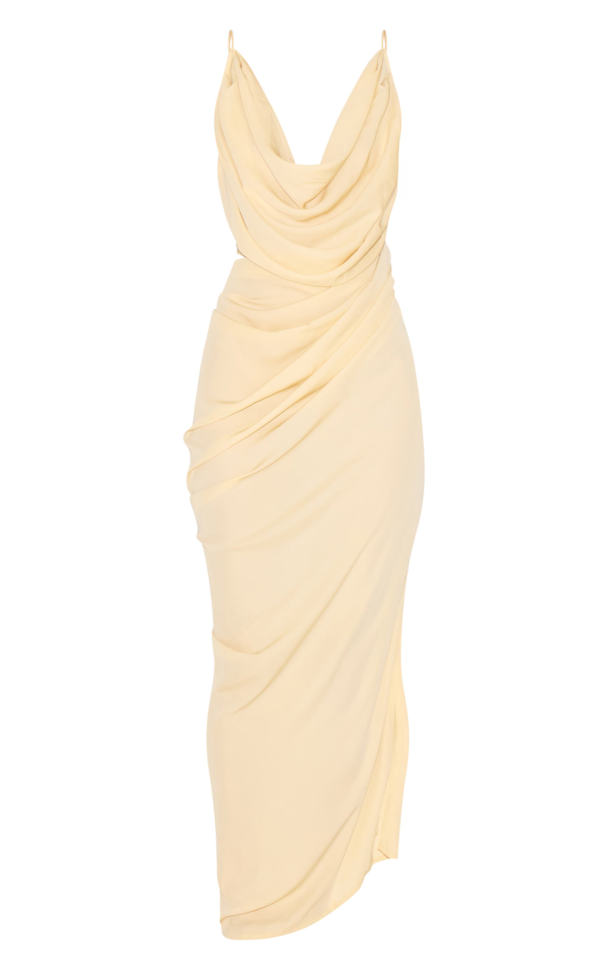 Be the best dressed in this butter yellow chiffon drape cut out maxi dress. Formed from butter yellow chiffon material, with a drape design and a cut out detailing for a standout finish. Team this maxi dress with a pair of heels and gold accessories for a head turning look.