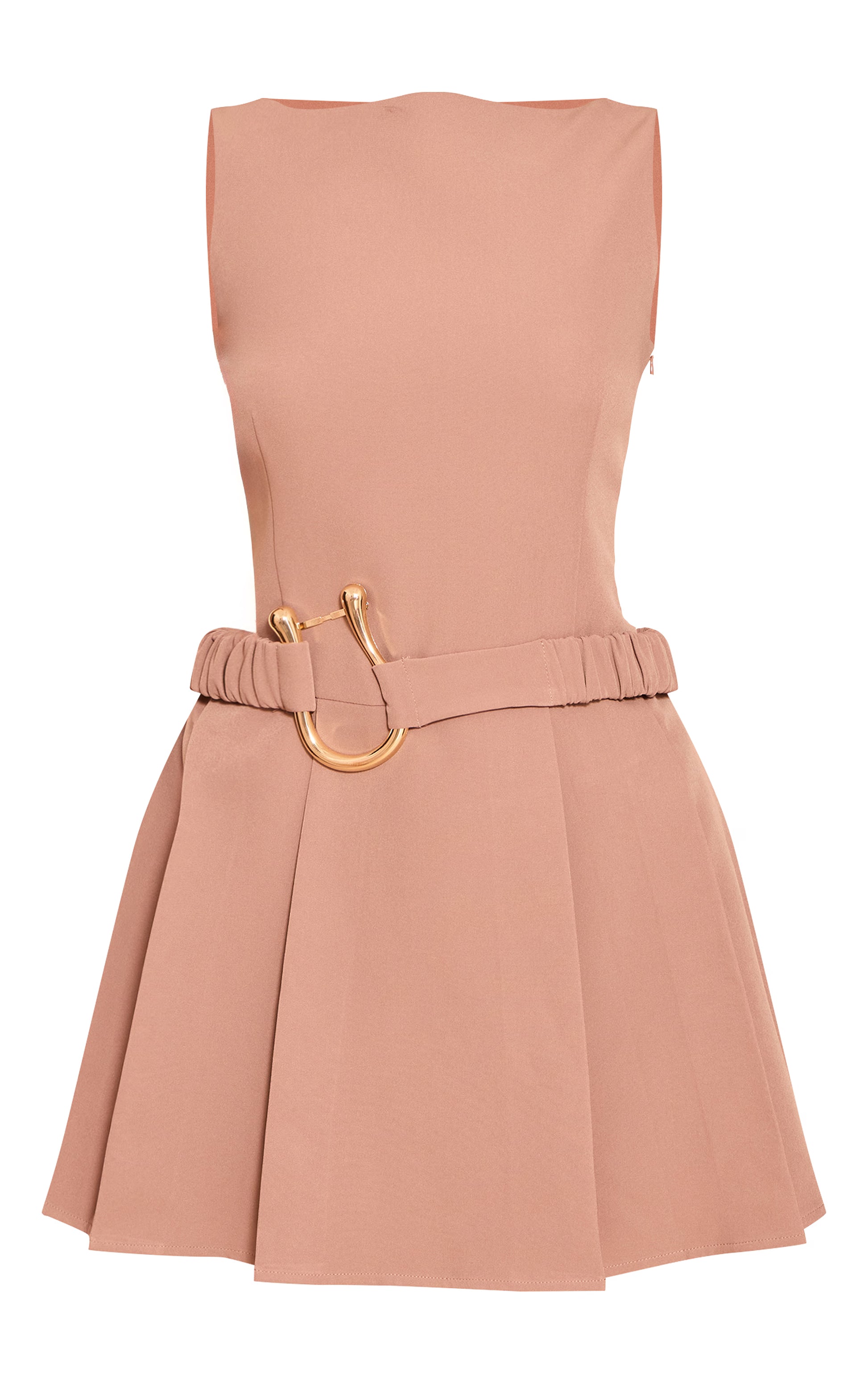 Refine your warm-weather wardrobe with the beige woven belt detail pleated shift dress. Made from a beige woven fabric with pleated detail and a belted waist, it balances structure and femininity. Style with strappy kitten heels and gold jewelry for a polished finish.