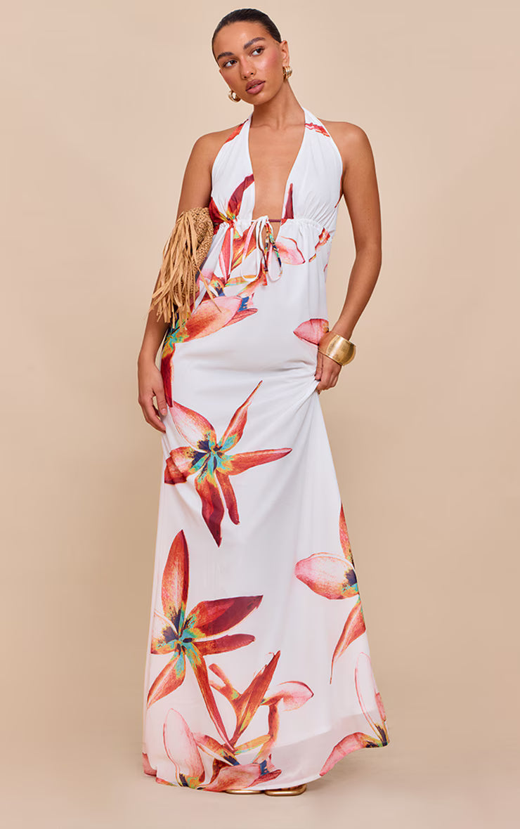 Cream Printed Plunge Tie Detail Maxi Dress
