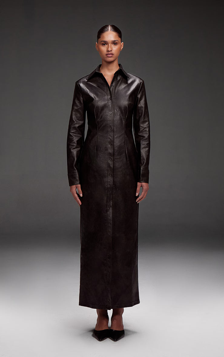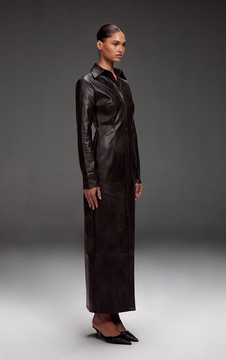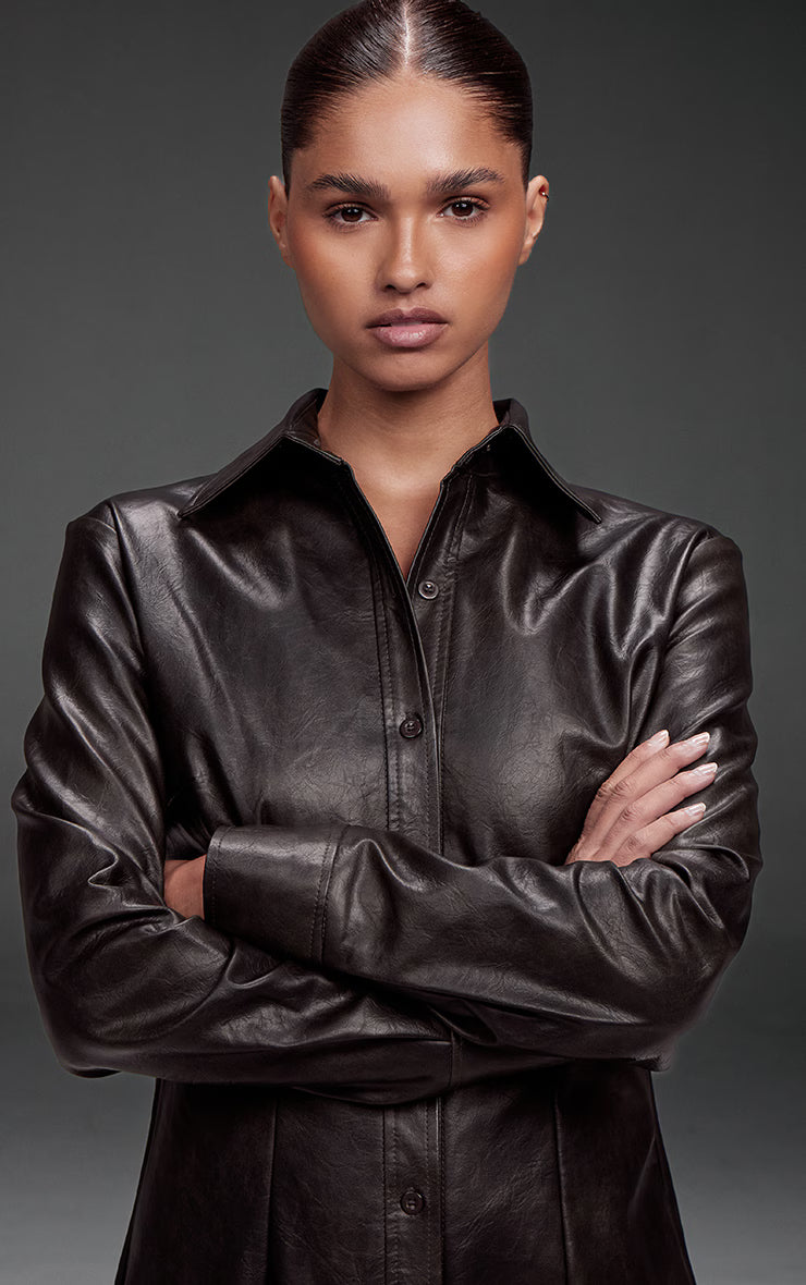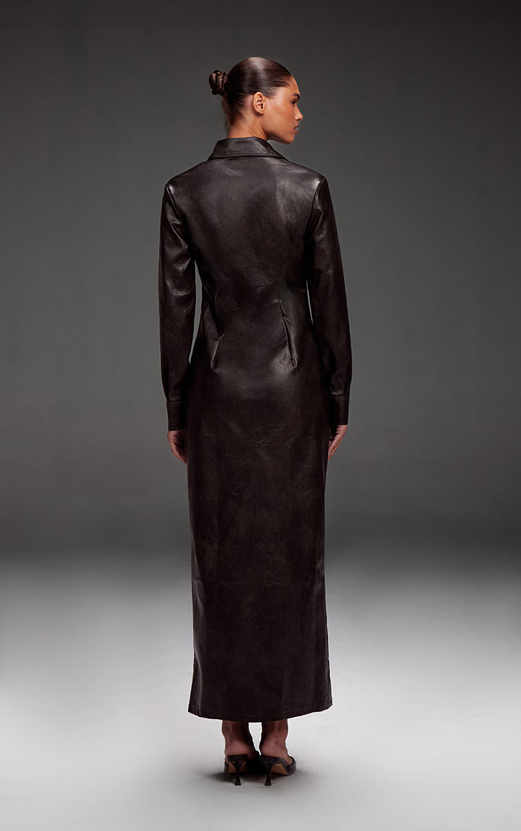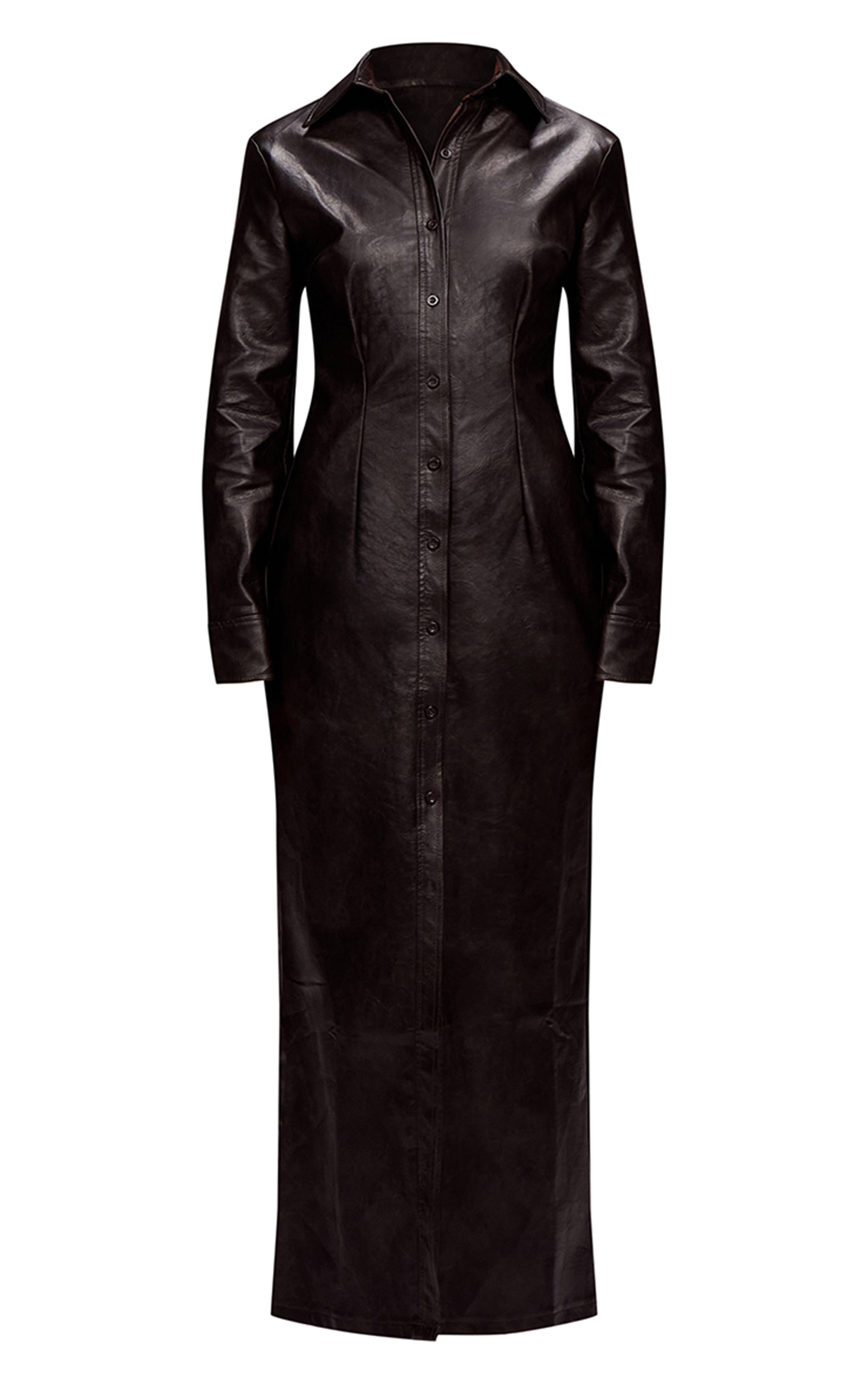 Introducing the maxi dress, re-imagined. This black washed faux leather button-up offers a directional take on after-dark dressing. The washed finish brings a tactile edge to the sleek faux leather, lending it a vintage-inspired feel with modern sensibilities. Note the button-up detailing which allows for versatile styling – wear it closed as a statement dress or open as a cool, contemporary duster. Elevate the look with a sculptural silver cuff from our jewelry collection to complete a considered evening ensemble.